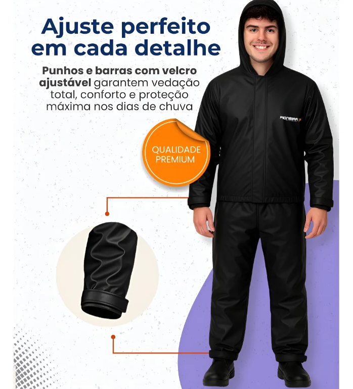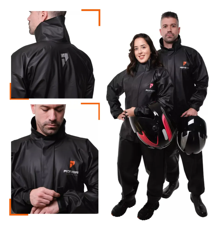 Fabricado com material resistente e impermeavel, o conjunto ajuda a manter o motociclista seco mesmo em dias de chuva intensa. Seu acabamento reforcado proporciona maior durabilidade, sendo ideal para uso frequente.